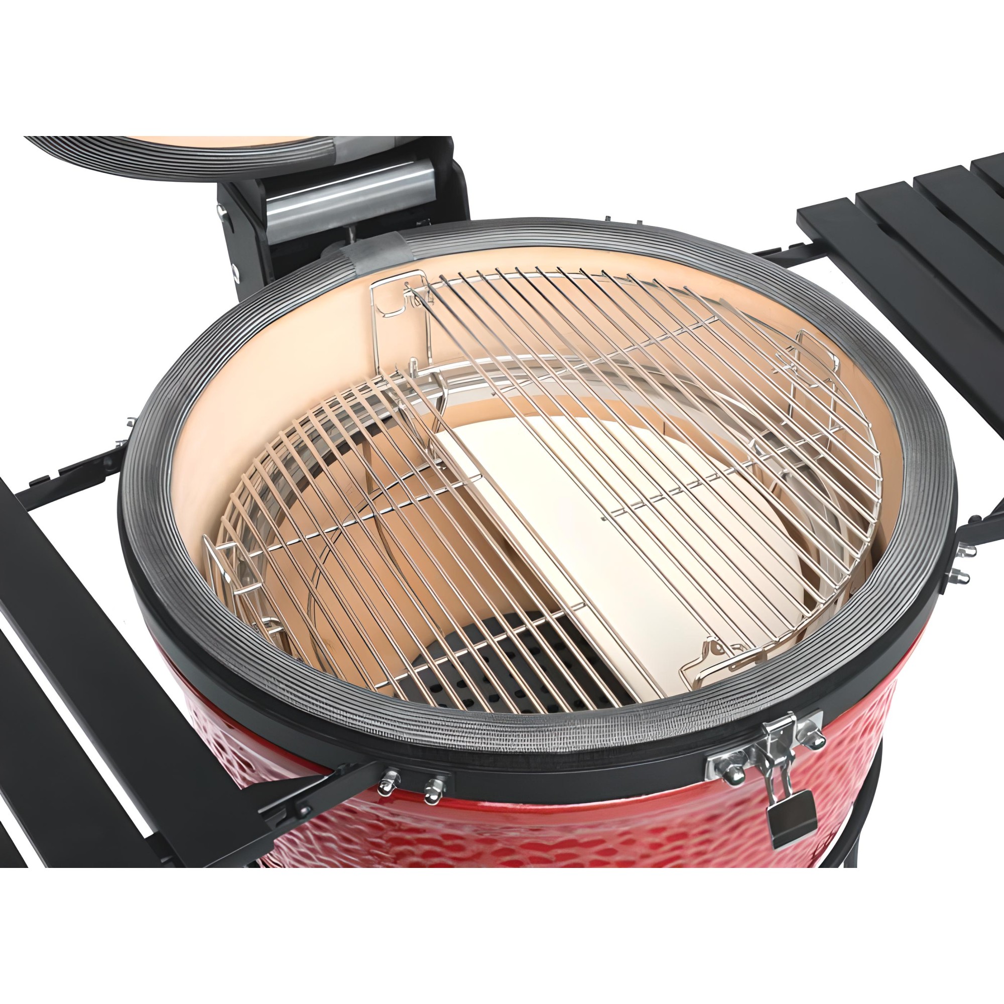 Diferentes zonas de calor: Cree diferentes zonas de calor en el kamado con el deflector de calor de media luna, un diseño innovador que bloquea parcialmente el calor para proporcionar calor indirecto y llama abierta.