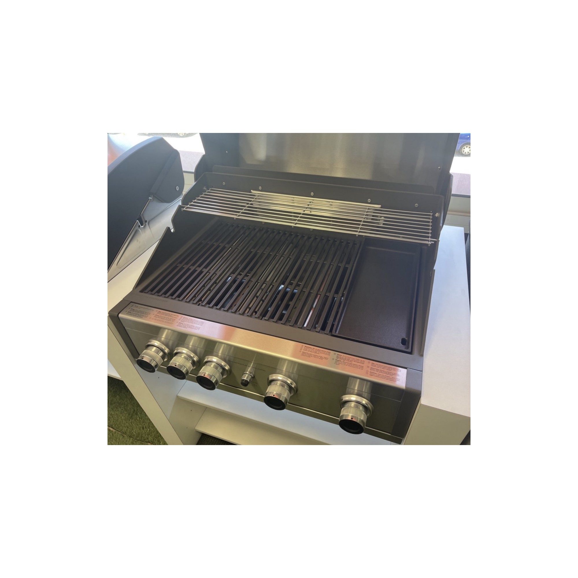 La parrilla principal mide 72 x 45 cm y cuenta con una parrilla secundaria de 73 x 17 cm, ideal para cocinar en varios niveles. Es compatible con gas butano/propano (GLP) y gas natural, e incluye tres parrillas de hierro fundido de 18 x 44 cm y una plancha de hierro fundido esmaltado de 17 x 44 cm. La tapa incorpora un termómetro integrado, la bandeja de grasa es extraíble y el sistema de encendido electrónico garantiza un uso cómodo y seguro.