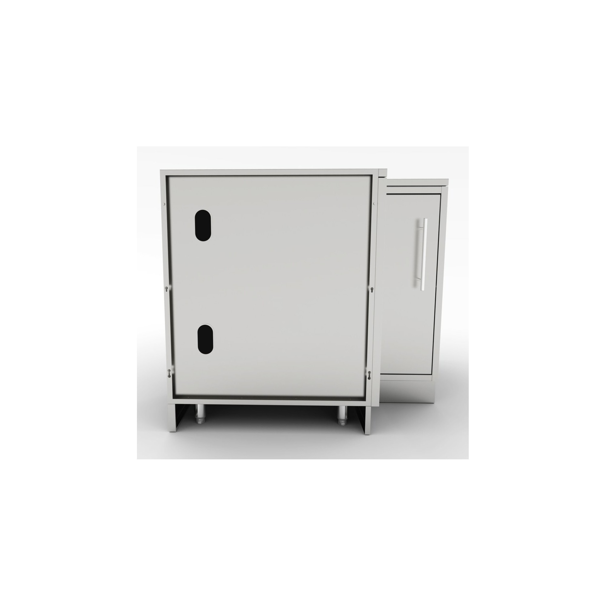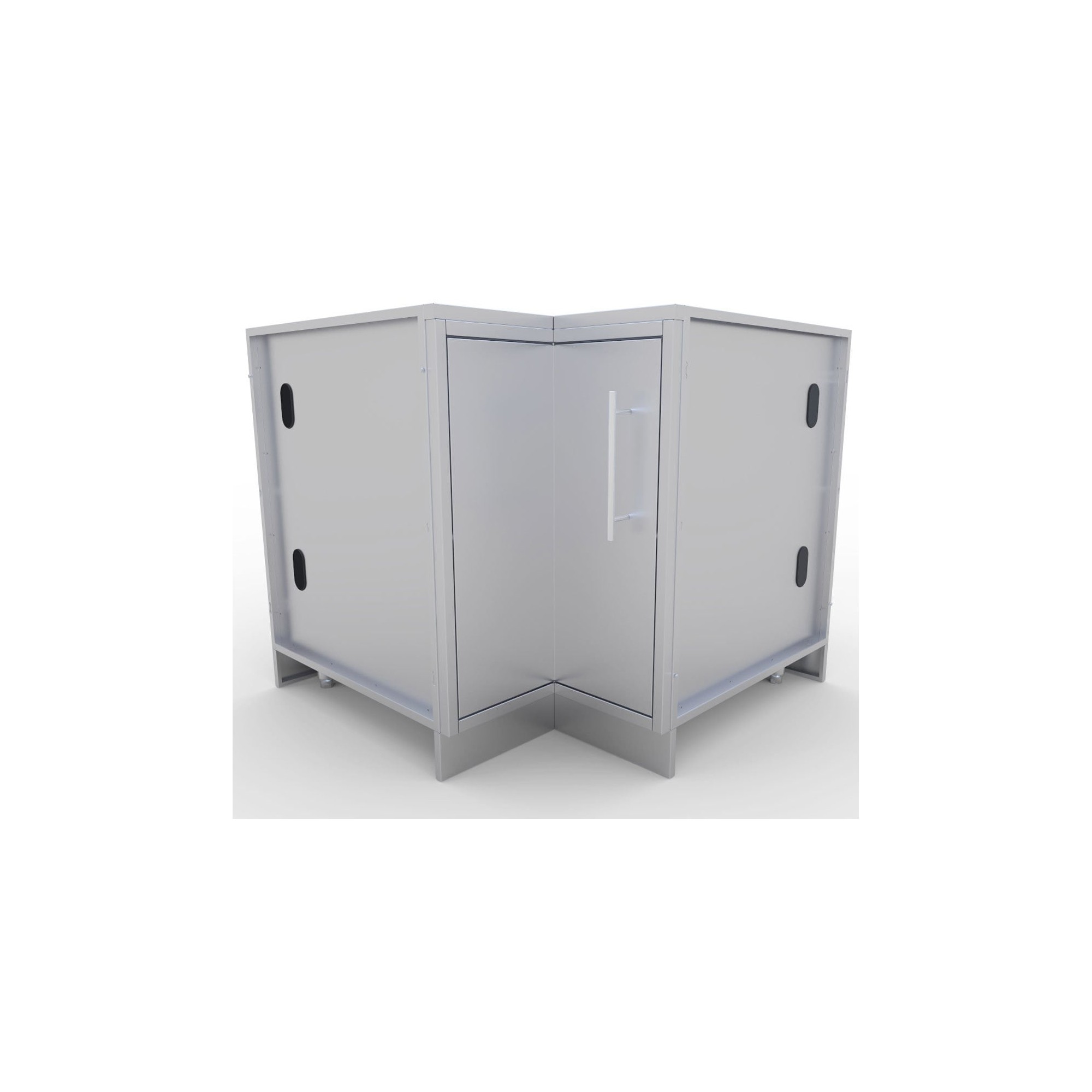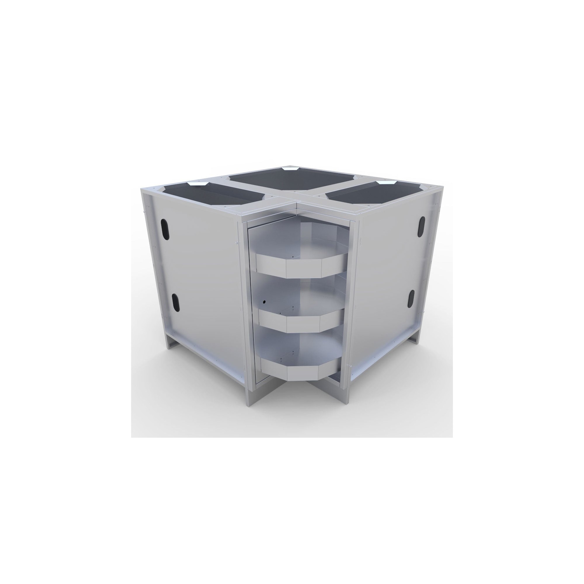 El módulo Inox. rinconera está construido enteramente de Acero Inoxidable grado 304 del calibre 16 y 18 y se caracteriza por su gran capacidad de almacenamiento interior y su hueco ya preparado para colocar un fregadero o un quemador lateral de encastrar. Incluye tres repisas "Lazy Susan" rotatorias de 360 grados insertadas en el marco de la puerta frontal, ideales para almacenar nuestros útiles y consumibles y protegiendo estos de cualquier elemento de la intemperie cuando la puerta esté cerrada.